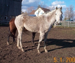 PaddyBarn Name: Paddy (aka Patrick) Breed: Thoroughbred Height: 16.1hh Age: 12 yrs Gender: Gelding Colour: Grey Health: Excellent (but apparently the foster home has recently found some lumps under his tail - melanomas?? I will post more details once they are available) Lameness: Some Arthritis Starting in Front Legs Vices: none Personality: Friendly. Easy to Catch, Lead, Groom, Trailer, etc. (he acts studdish with mares when geldings are around so he is better suited to be with just mares or just geldings, not both). History/Training: Hunter, Jumper, Dressage, Trails Future/Suitability: Companion, Light Pleasure Riding/Hacking by a Light-Weight Experienced Rider Adoption Fee/Purchase Price: $800 Cdn Pre-Winter Price Reduction - If You Are Approved to Adopt Paddy, Pay for Him in Full and Take Him Home Before the end of November - We Will Reduce His Adoption Fee Down to $500 !!Current Status: Located at a Foster Home in Greenbank, ON ~ Available for Adoption/Sale or Fostering/Lease. If you have any questions about Paddy please email Claire at HCW. if you would like to make an appointment to see Paddy please call his foster mom, Rosemarie, at: 905-986-0489. Thanks.